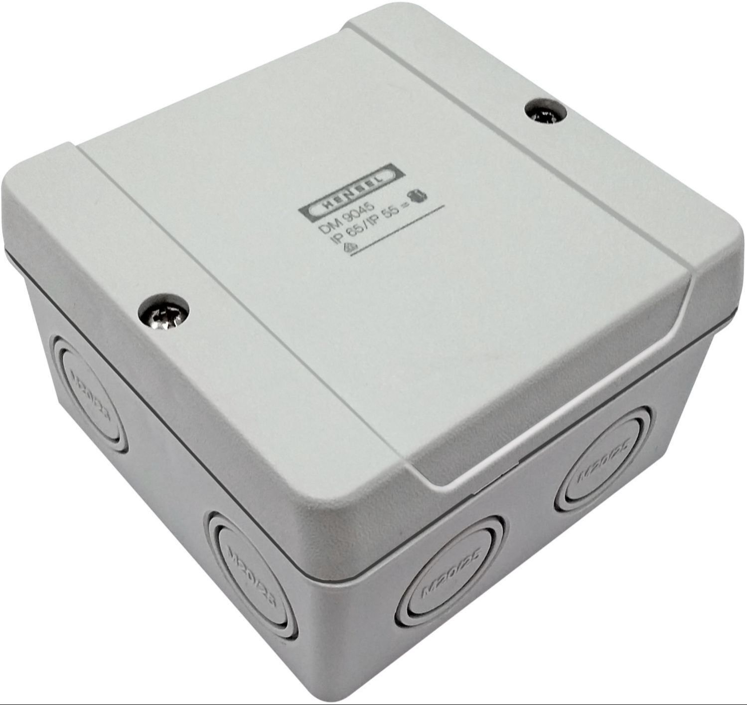 Thermoplastic junction box Size (98 X 98 x 61 )mm with terminals 5-pole per pole 6 x 1.5 mm² sol, 4 x 2.5 mm² sol, 3 x 4 mm² sol. Features knockout cable entry and is suitable for both indoor and protected outdoor environments. Available in grey (RAL 7035).